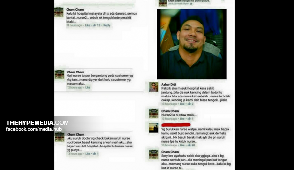 Menggunakan nama Cham Cham di akaun Facebooknya, individu ini memuatnaik satu posting berkenaan, seolah-olah menampakkan jururawat suka mengambil kesempatan untuk melihat kemaluan lelaki.